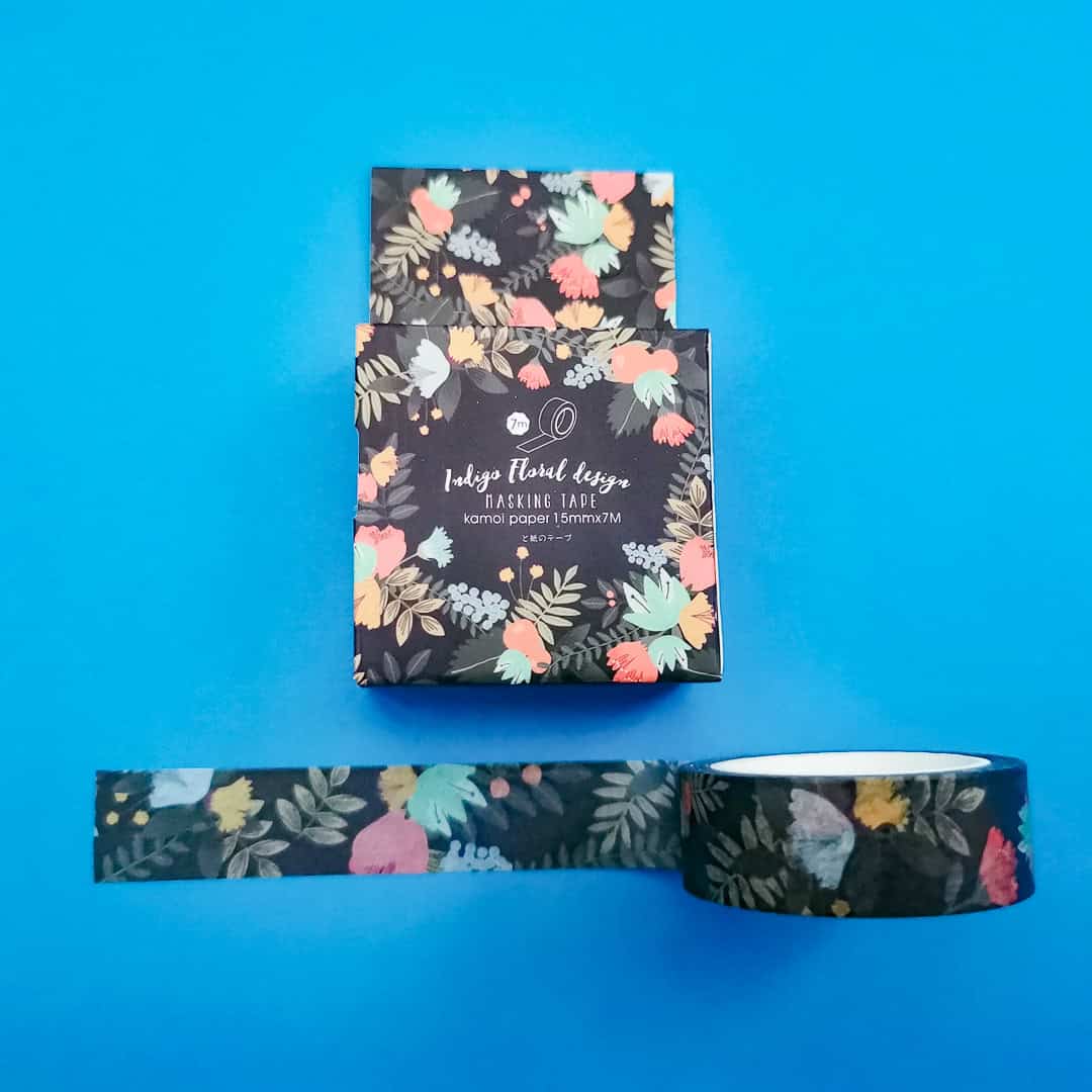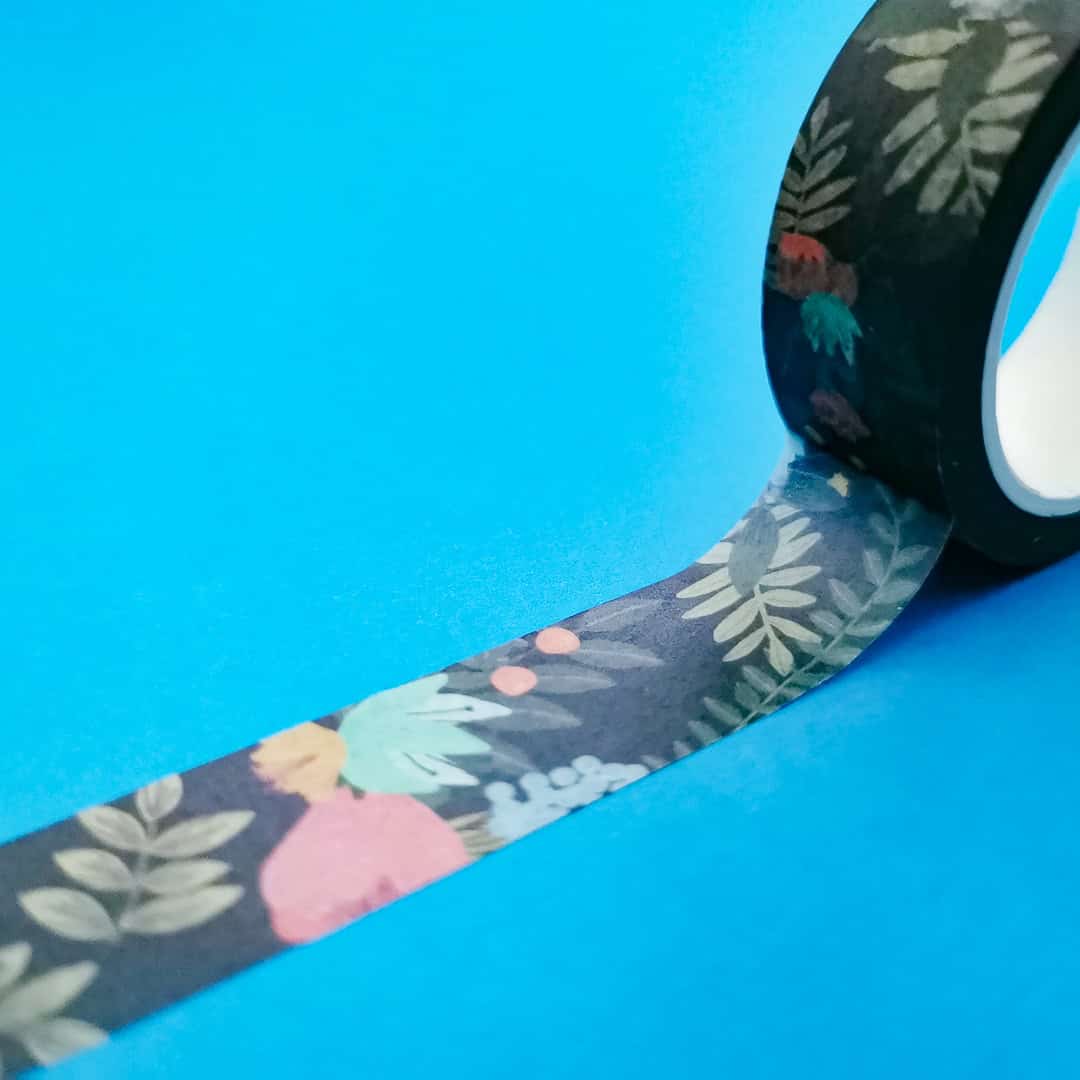 Beautiful and unusual dark blue/black washi tape with a bright floral pattern.