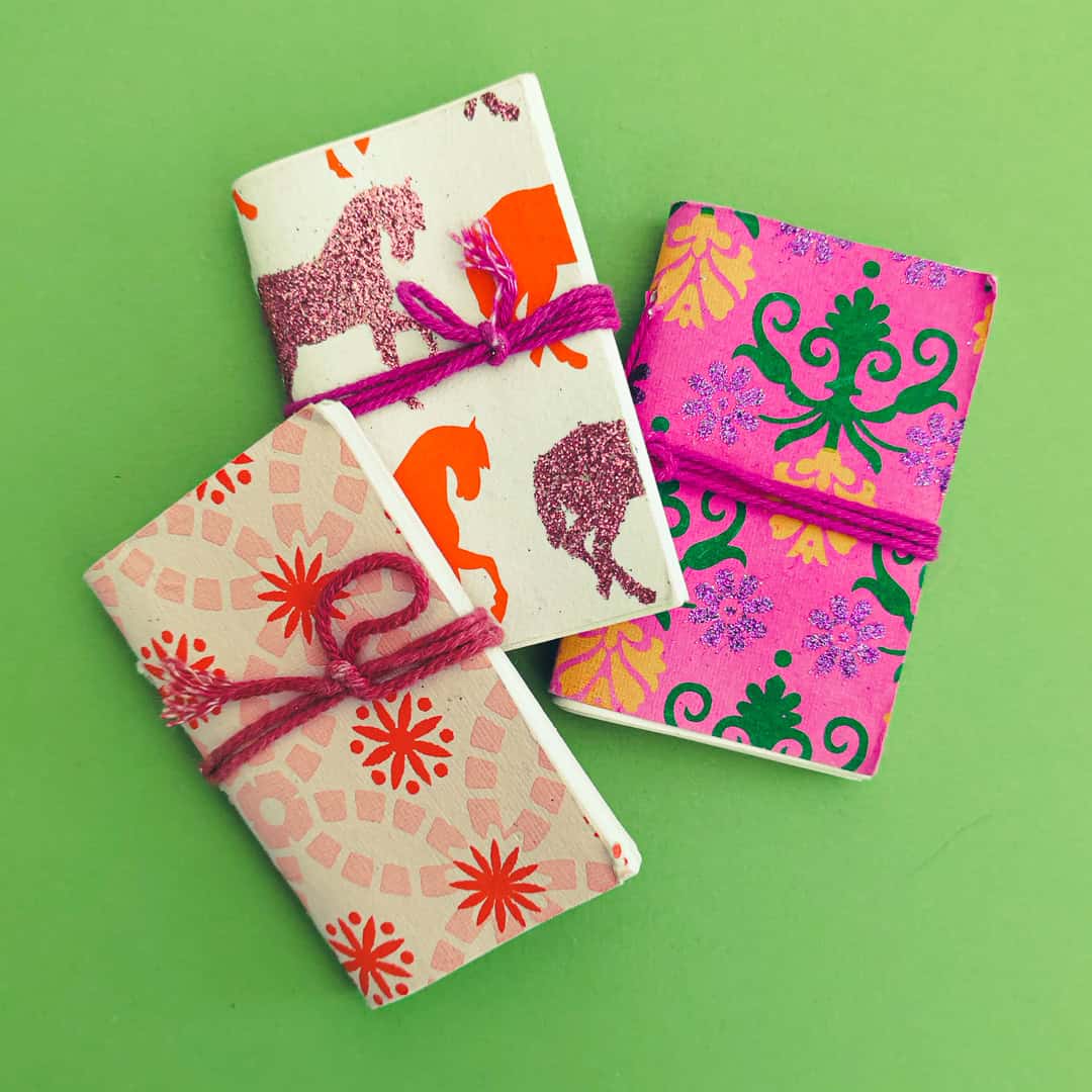 A teeny tiny notebook with a tie closure. Colour & style is selected at random.